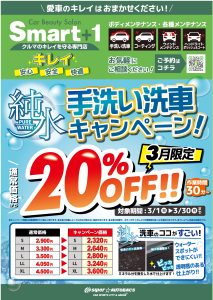 純水手洗い洗車割引キャンペーンのお知らせ Smart+1 NAGOYA BAYでは、純水手洗い洗車割引キャンペーンを3月…
