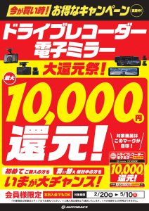 ドライブレコーダー&電子ミラー大還元祭を開催しています!! 対象のドライブレコーダー&電子ミラーが最大で1…