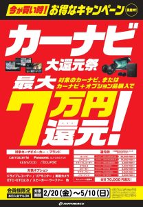 カーナビ大還元祭を開催しています!! 対象のカーナビ、またはカーナビ+オプション品購入で最大70,000円…